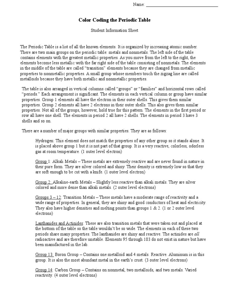 6+ Color Coding The Periodic Table Student Worksheet Pdf